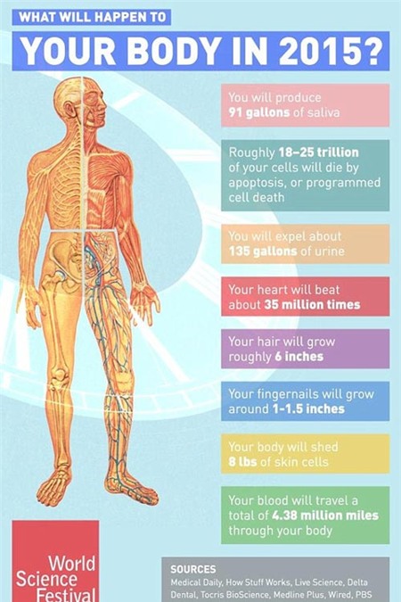 Dựa vào kết quả các nghiên cứu đã được tăng trải trên website và tạp chí khoa học, trang World Science Festival đã tạo ra một bức đồ họa tổng kết những "thành tựu" mà cơ thể của chúng ta dự kiến sẽ đạt được sau một năm lao động vất vả.