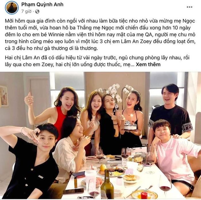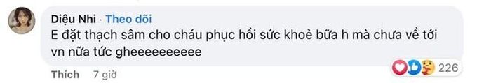 Bức ảnh được Phạm Quỳnh Anh - một người bạn thân thiết của nữ ca sĩ chia sẻ. Ngay bên dưới bài đăng, Diệu Nhi cũng vào để lại bình luận gửi gắm đến bé Winnie - con gái Đông Nhi: “Em đặt thạch sâm cho cháu phục hồi sức khỏe bữa giờ mà chưa về tới Việt Nam nữa tức ghê”.