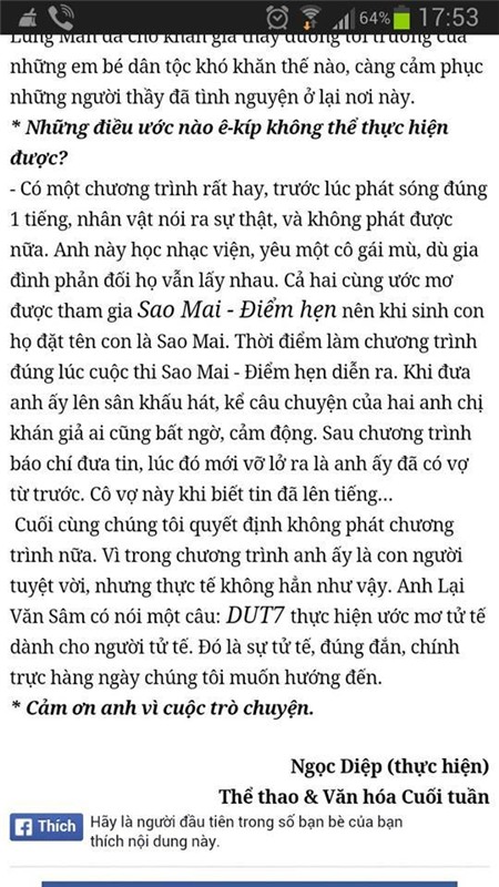 Cô vợ này khi biết tin đã lên tiếng…Cuối cùng chúng tôi quyết định không phát chương trình nữa. Vì trong chương trình anh ấy là con người tuyệt vời, nhưng thực tế không hẳn như vậy”.