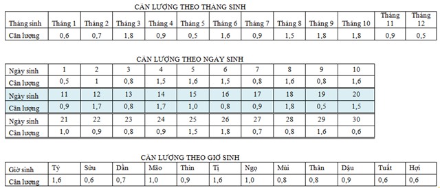 Ví dụ một người sinh giờ Tý ngày 30 tháng 2 năm Quý Mùi thì có cân lượng như sau: