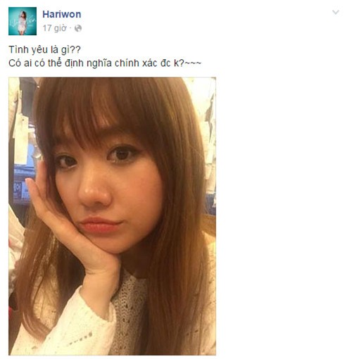 Mới đây, Hari Won đã đăng tải dòng chia sẻ với trạng thái buồn trên facebook: "Tình yêu là gì? Có ai định nghĩa chính xác được không?".