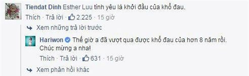 Trên trang facebook của mình, Hari Won đã đăng dòng trạng thái hỏi về tình yêu. Người yêu cũ Đinh Tiến Đạt ngay lập tức cho cô đáp án.