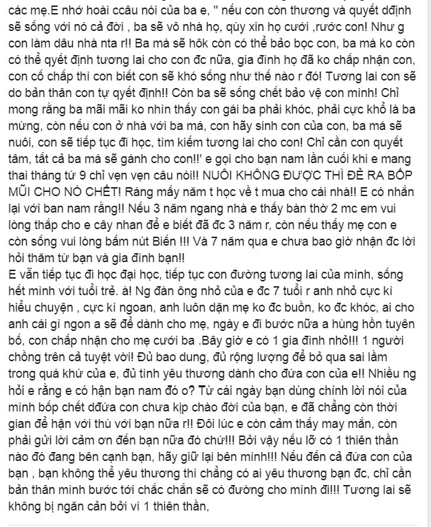 Em gọi cho bạn nam lần cuối khi em mang thai tháng thứ 9, chỉ vẹn vẹn câu nói: "NUÔI KHÔNG ĐƯỢC THÌ ĐẺ RA BÓP MŨI CHO NÓ CHẾT! Ráng mấy năm tôi học về tôi mua cho cái nhà!!". Em có nhắn lại với bạn nam rằng: "Nếu 3 năm ngang nhà em thấy bàn thờ 2 mẹ con em vui lòng thắp cho e cây nhang để em biết đã được 3 năm rồi. Còn nếu thấy mẹ con em còn sống vui lòng bấm nút Biến!!!". Và 7 năm qua em chưa bao giờ nhận được lời hỏi thăm từ bạn và gia đình bạn!!