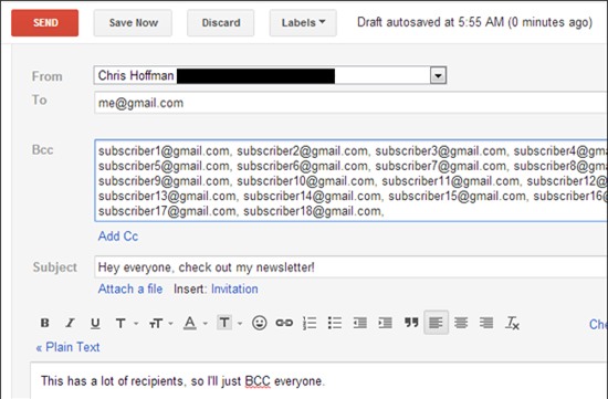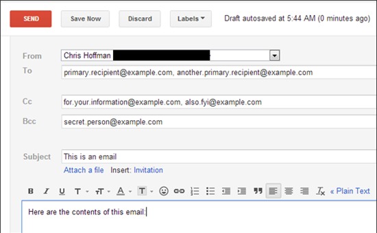 Tuy nhiên hai tính năng này lại khác nhau ở danh sách người nhận. Đối với CC, những người trong danh sách nhận có thể nhìn thấy địa chỉ email của nhau. Nghĩa là bạn sẽ không thể ôm mộng tưởng rằng mình là người đặc biệt, chỉ một mình mình được nhận cái email quý giá đó đâu!