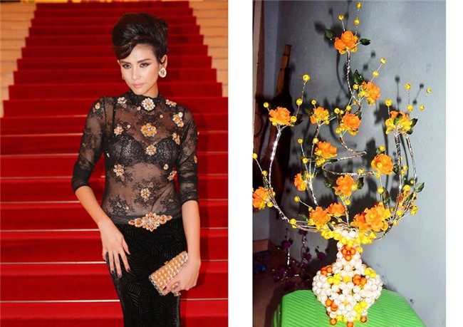 Có vẻ như Hoàng Yến đã mượn tạm màu sắc và hình ảnh hoa mai pha lê rực rỡ để làm điệu thêm cho chiếc váy.