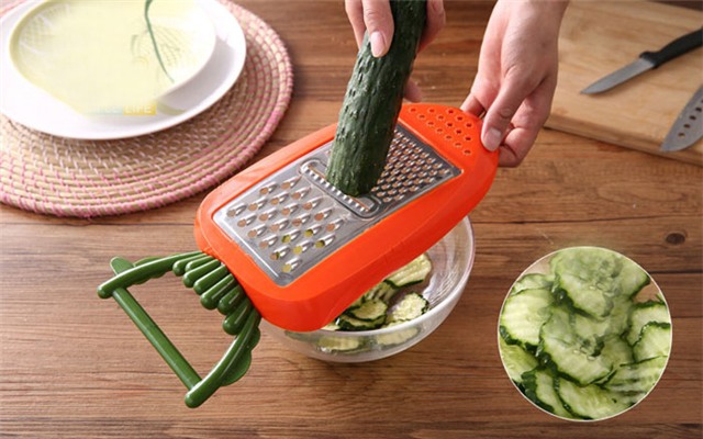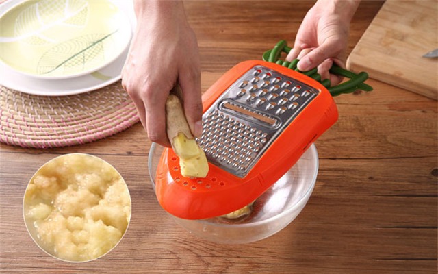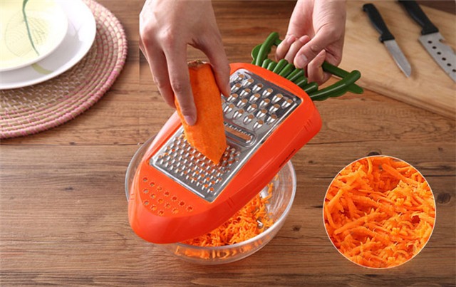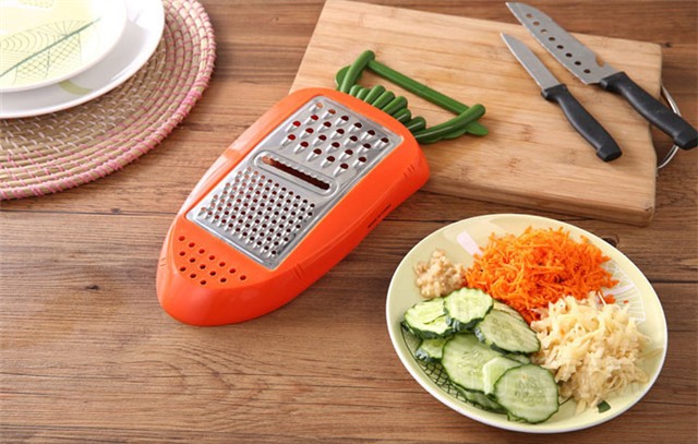 Dụng cụ nhỏ nhắn được sáng tạo dựa trên hình ảnh củ cà rốt to tròn với màu cam nổi bần bật. Với nó, các bạn sẽ thao tác được rất nhiều công đoạn khi chế biến món ăn từ các loại củ như dưa leo, cà rốt, su su, củ cải, khoai tây... Phần lưỡi sắc bén của nó hỗ trợ bạn thái lát mỏng, bào sợi dài, bào vụn hay nghiền nát nhanh chóng, đều đẹp, tay cầm thì rất vững chắc, an toàn. Sản phẩm có kích thước 34 x 15.5cm, làm bằng nhựa PP và thép không gỉ. Giá tham khảo: 25.000 đồng/ chiếc.