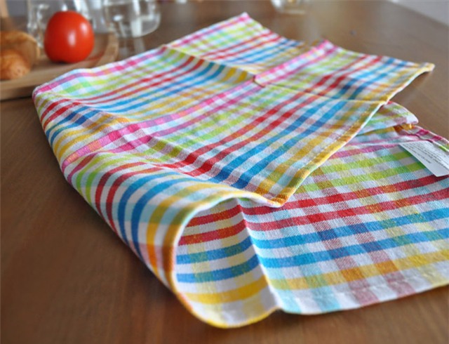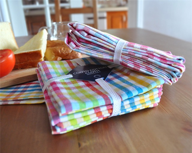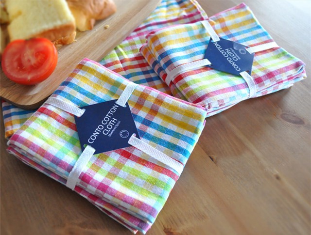 Sự hiện diện của những tấm khăn với họa tiết ca rô nhiều màu xen kẽ nổi bật như sắc cầu vồng giúp căn bếp nhỏ thêm đáng yêu và thu hút. Chức năng của chúng khá linh hoạt, các bà nội trợ có thể được sử dụng làm khăn ăn, khăn lau chùi, vệ sinh, khăn che đậy dụng cụ bếp,… đều được cả. Sản phẩm làm bằng vải dệt may mềm mại, mỏng nhẹ, an toàn với làn da của người sử dụng. Mỗi tấm khăn có kích thước 65 x 40 cm. Giá tham khảo: 15.000 đồng/ tấm.