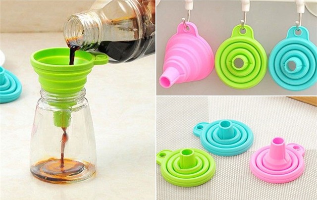 Thử so sánh chiếc phễu này với thiết kế quen thuộc, bạn sẽ nhận thấy sự khác biệt rõ rệt. Nếu các chiếc phễu bình thường cố định kích thước, không thể thay đổi, lưu trữ tốn không gian bếp thì thiết kế này tuyệt vời hơn khi bạn dễ dàng tùy chỉnh độ lớn bé, dùng xong có thể xếp lại tối đa thành hình tròn và treo lên ngăn nắp. Sản phẩm được làm bằng chất liệu silicone, mềm dẻo, độ bền cao, kích thước khi mở rộng tối đa là 14 cm. Phễu có hai màu hồng và xanh dương nhạt, giá tham khảo: 20.000 đồng/ chiếc.