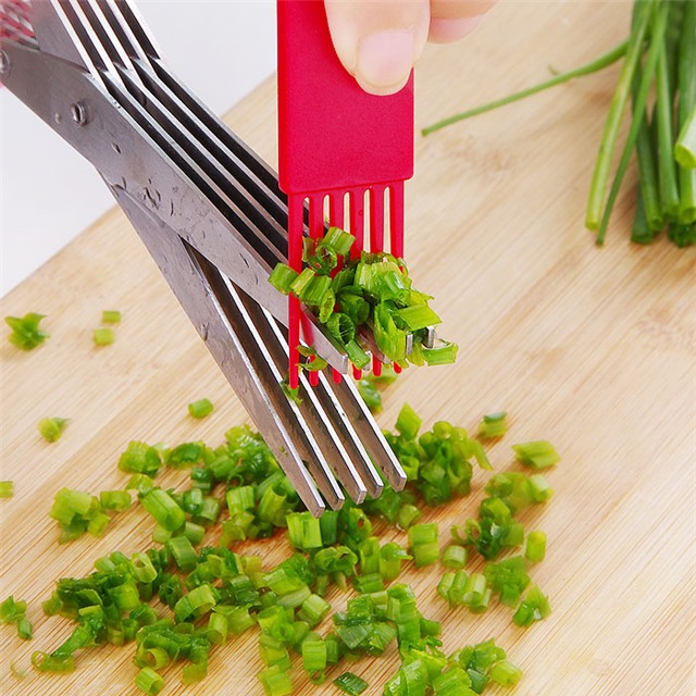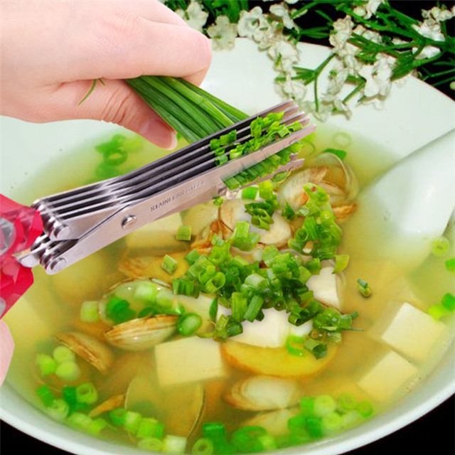 Chiếc kéo được thiết kế với nhiều lưỡi song song, làm thay việc của chiếc dao khi bạn xắt hành ngò hay cắt lá rong biển... Thiết kế kéo với tay cầm chắc chắn, thao tác sử dụng nhanh chóng, cho ra thành phẩm đều và đẹp, hơn nữa lại tiết kiệm thời gian khi chế biến. Sản phẩm có kích thước 19 x 7.5 x 1.7 cm, tay cầm bằng nhựa, lưỡi bằng thép không gỉ sắc bén, ngoài ra còn kèm theo dụng cụ gạt hành ngò bám trên lưỡi kéo. Màu sắc phong phú như: đỏ, hồng, xanh lá cây, xanh dương,… Giá tham khảo: 30.000 đồng/ chiếc.