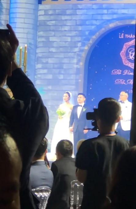 Đến giờ lành, cô dâu - chú rể xuất hiện tiếp đón và chụp hình cùng khách khứa. Trong khi con trai bầu Hiển bảnh bao với vest tông trầm, Hoa hậu Việt Nam 2016 dịu dàng, nữ tính với chiếc váy trắng tinh khôi.