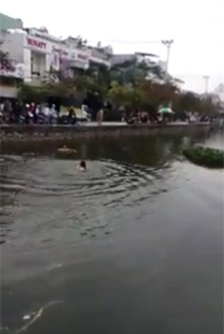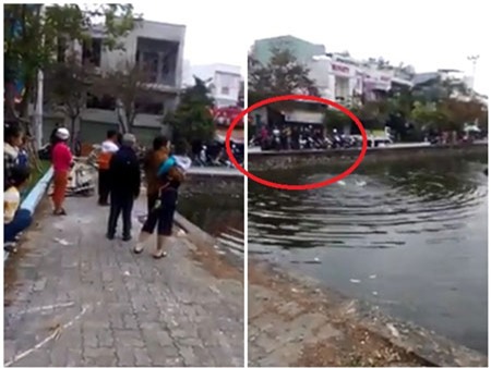 Khi không nhìn thấy nam thanh niên trên hồ, mọi người mới hốt hoảng hò nhau nhảy xuống tìm kiếm. (Ảnh cắt từ clip) |