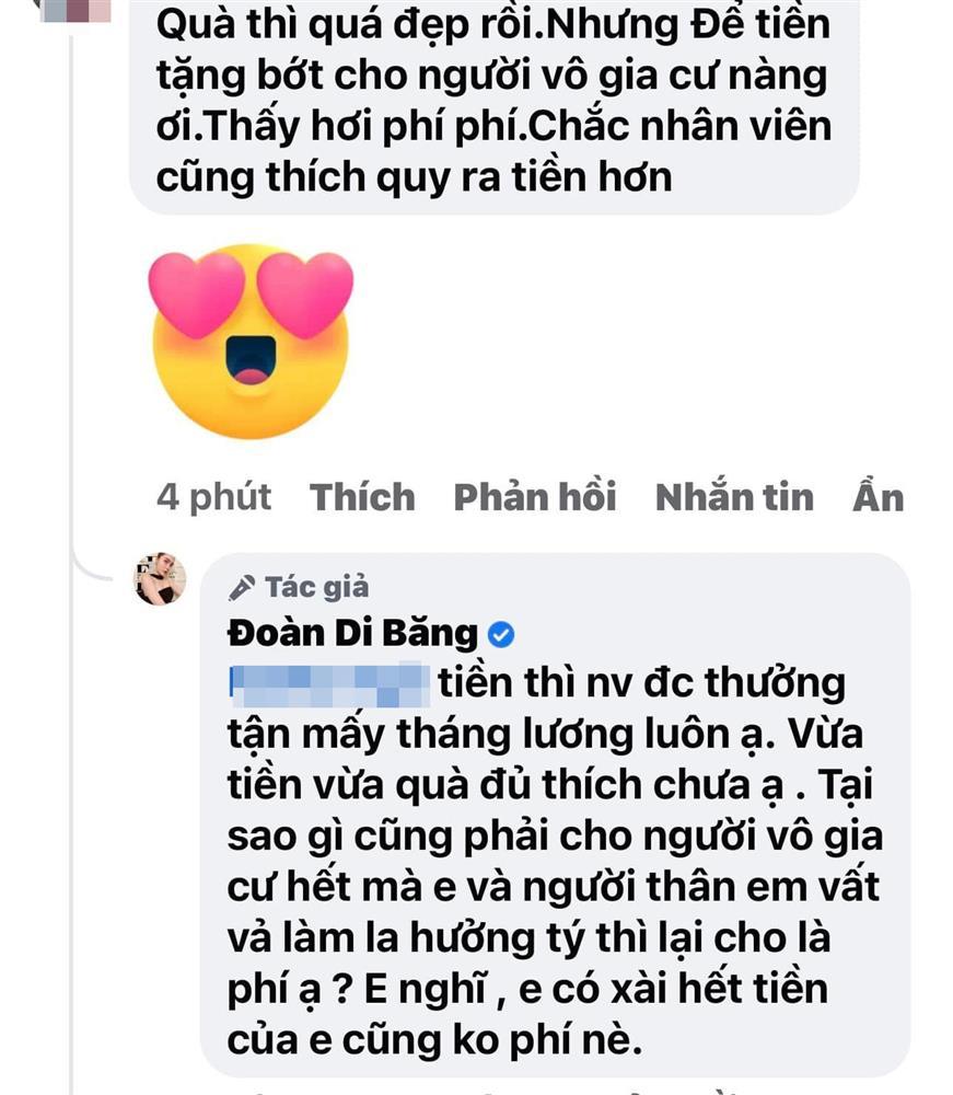 Mới đây trên trang cá nhân, Đoàn Di Băng có chia sẻ gây chú ý. Đăng ảnh đi phát quà cho mọi người cùng ảnh chụp màn hình tài khoản nói xấu mình, cô có những phát ngôn cực căng.