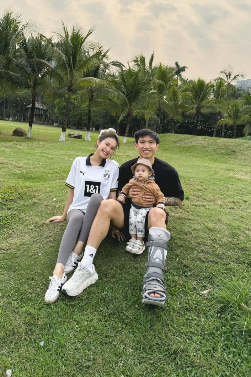 Đặc biệt, dù chân của Văn Hậu có thời gian phải mang nẹp bảo vệ do chấn thương, anh vẫn ngồi xuống cỏ để chụp ảnh gia đình, thể hiện sự hy sinh và tình yêu lớn dành cho vợ con.