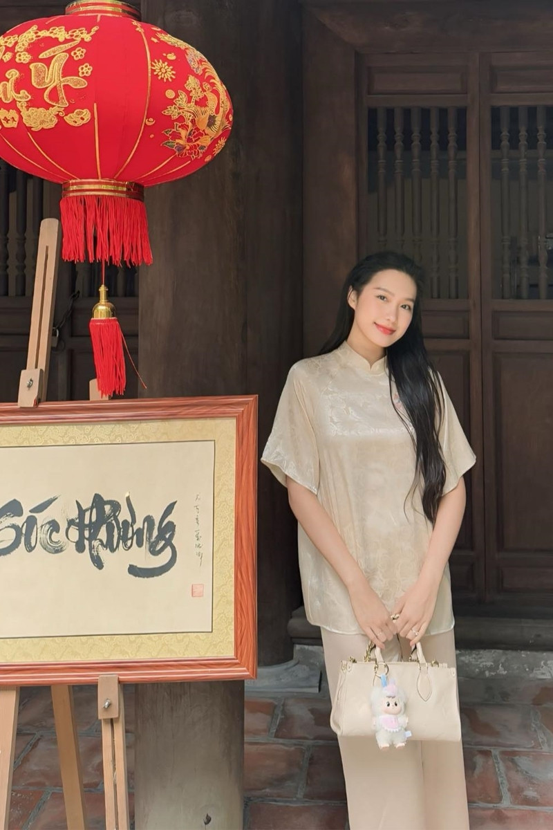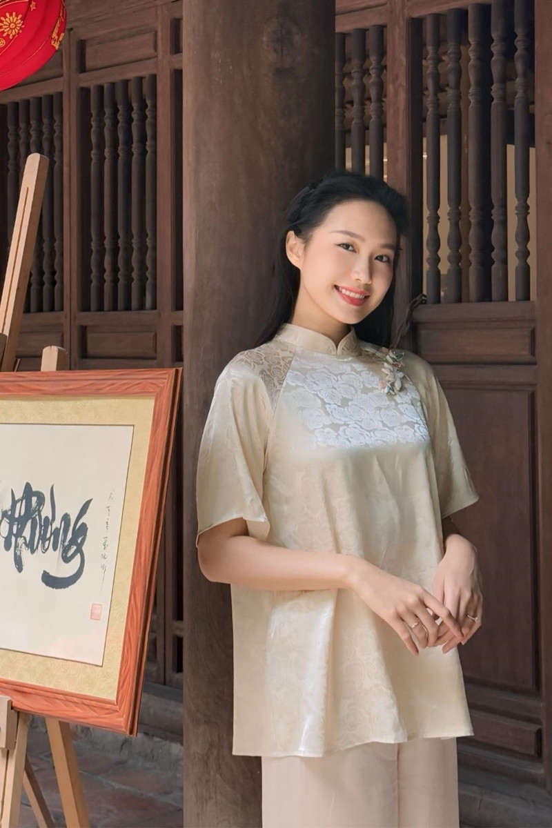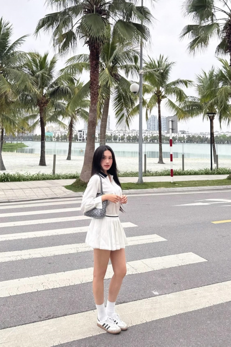Hải My cũng duyên dáng trong bộ áo dài cách tân màu be kết hợp với quần tông màu đồng điệu. Phong cách của Hải My còn được thể hiện qua những trang phục năng động nhưng không kém phần thanh lịch như set đồ trắng gồm áo sơ mi phối cùng chân váy tennis, hoàn thiện với đôi giày sneaker trắng và tất cao, tạo nên vẻ ngoài trẻ trung, năng động nhưng vẫn giữ được nét dịu dàng, nữ tính vốn có.