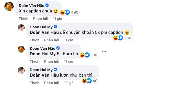 Đáng nói, Đoàn Văn Hậu nhanh chóng vào gặng hỏi bạn gái: "Xin caption chưa?". Doãn Hải My cũng nhanh chóng đáp lại hài hước: "Để chuyển khoản 5k phí caption". Tuy nhiên, nam cầu thủ vẫn trêu cô: "5k Euro hả?". Đứng trước câu hỏi này, Doãn Hải My mắng yêu bạn trai: "Lươn như bạn thì…"