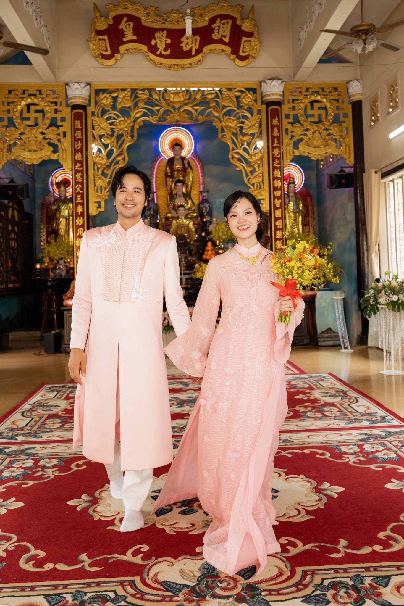 Trong Lễ Hằng thuận đầy ý nghĩa, cô dâu chú rể diện áo dài đôi màu hồng. Bà xã của Đoàn Minh Tài - Sunny Đan Ngọc lựa chọn phong cách làm tóc và trang điểm tự nhiên khoe visual rạng rỡ, xinh đẹp.
