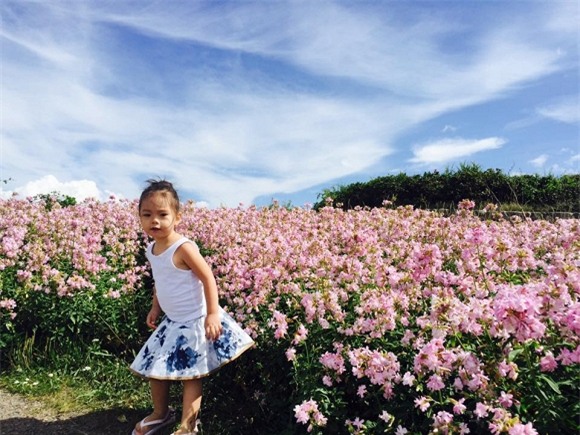 Hai mẹ con Đoan Trang tận hưởng không khí trong lành bên vườn hoa