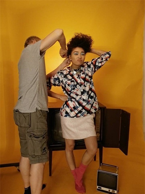 Ngô Thanh Vân tinh nghịch, "quậy phá" trong hậu trường buổi chụp hình. Nữ diễn viên không chịu đứng yên trong lúc được làm tóc.