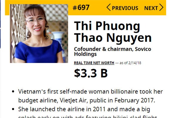 Theo Forbes, tính tới 14/2, bà Nguyễn Thị Phương Thảo có khối tài sản lên tới 3,3 tỷ USD, xếp thứ 697 trên thế giới.