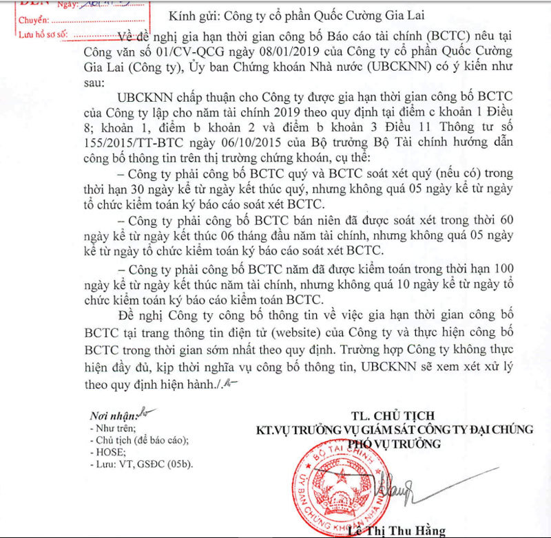 Lý do Quốc Cường Gia Lai xin gia hạn thời gian công bố BCTC là do công ty có trụ sở chính ở Gia Lai, văn phòng đại diện tại TP.HCM và các công ty con có hoạt động đầu tư dự án tại khắp vùng miền trong cả nước. Do đó, việc tập hợp số liệu phục vụ công tác lập báo cáo tài chính riêng và báo cáo tài chính hợp nhất mất rất nhiều thời gian.