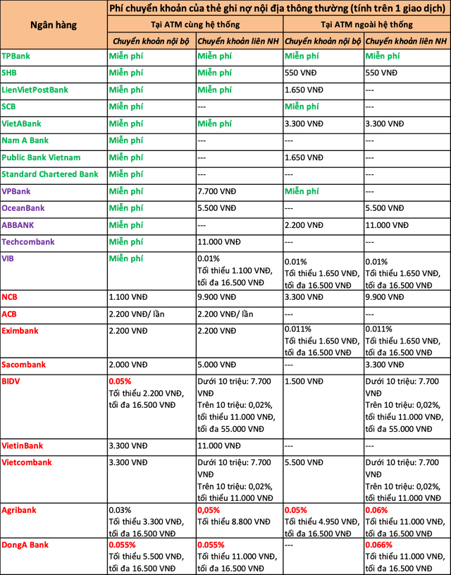 Khảo sát của chúng tôi tại hơn 20 ngân hàng cho thấy, hiện có nhiều ngân hàng miễn phí chuyển khoản nội bộ tại các ATM cùng hệ thống với thẻ ghi nợ. Có thể kể đến như TPBank, SHB, LienVietPostBank, SCB, VietABank, Nam A Bank, Public Bank Vietnam, Standard Chartered Bank, VPBank, OceanBank, ABBank, Techcombank, VIB… Cũng tại các ngân hàng này, mức phí chuyển khoản liên ngân hàng tại ATM cùng hay khác hệ thống đều không quá cao, dao động từ mức miễn phí đến 11.000 VNĐ cho mỗi giao dịch thành công.