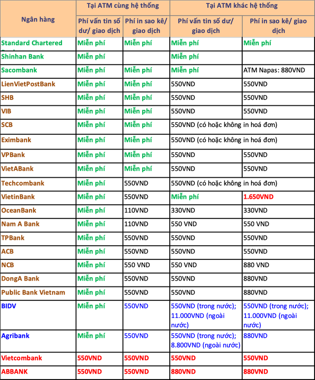 Vietcombank và ABBANK hiện áp dụng thu phí cho giao dịch ở mọi ATM. Cụ thể, Vietcombank đều thu mức phí 550 đồng khi khách hàng vấn tin hay in sao kê. Còn ABBANK thu 550 đồng cho mỗi giao dịch vấn tin hay in sao kê tại ATM của ABBANK và 880 đồng cho các giao dịch này tại ATM không thuộc ABBANK.