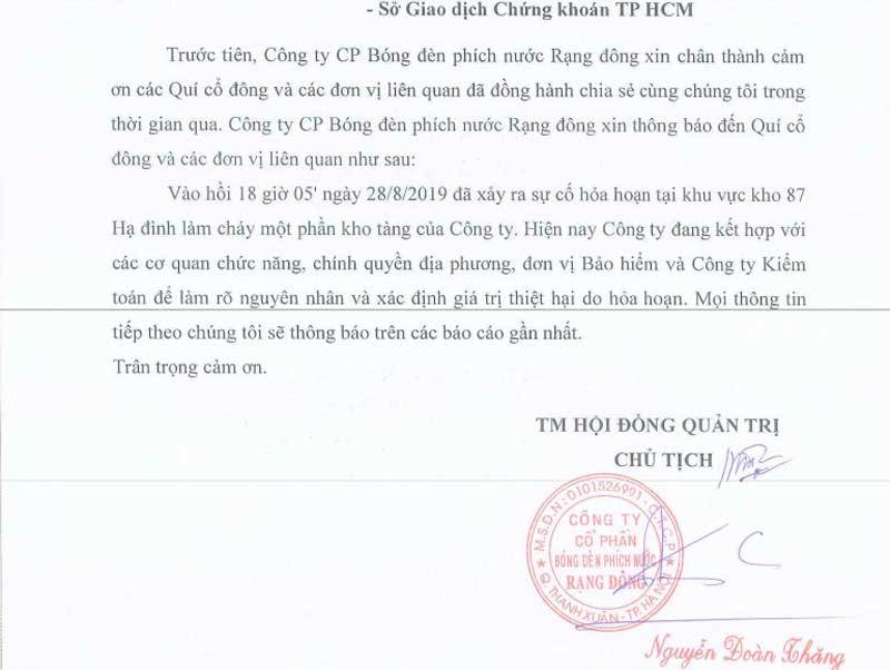 Trước đó, hôm 29/8 HOSE đã nhận được thông báo của RAL về việc xảy ra hỏa hoạn tại công ty. Tuy nhiên, Bóng đèn phích nước Rạng Đông chỉ thông báo về ngày giờ xảy ra sự cố hỏa hoạn tại khu vực kho 87 Hạ Đình làm cháy một phần kho. RAL cho biết công ty đang kết hợp với các cơ quan chức năng, chính quyền địa phương, đơn vị bảo hiểm và công ty kiểm toán để làm rõ nguyên nhân và xác định giá trị thiệt hại do hỏa hoạn. Mọi thông tin tiếp theo sẽ được công ty thông báo trên các báo cáo gần nhất.