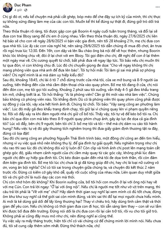Nam doanh nhân còn tiết lộ thêm: "Chị còn nhớ hôm đó không? Khi Boorin xuống cửa, bố tôi hỏi con muốn ở lại với ông nội hay về với mẹ Cún. Con trả lời ngay: “Ở lại với ông nội”. Nếu chị là người mẹ tốt như vờ vịt trên mạng, thì câu trả lời phải là “Về với mẹ” chứ? Hãy dành thời gian suy nghĩ lại xem mình có đủ tốt chưa, đừng ôm khư khư suy nghĩ cả thế giới sai còn mình đúng, và khi sai thì đổ tại mọi người chưa hiểu mình. Ai mới là kẻ dùng giả dối để lấy lòng thương hại? Thay vì chiêu trò, hãy dùng tình cảm thật và thời gian để yêu con. Nếu chị không có thời gian đưa con đi học, tôi sẵn sàng làm thay – con sẽ vui lắm khi được bố đưa đến trường. Đừng nói dối là chị đưa con rồi lại cản trở tôi, rồi vu cho tôi giở trò. Không phải ai cũng đầy mưu mô như chị, nên đừng nghĩ ai cũng thế.