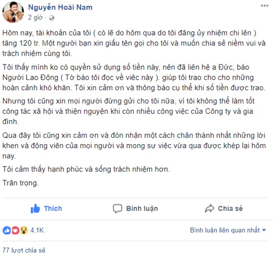 "Tôi xin cảm ơn và thông báo cụ thể khi số tiền được trao", vị doanh nhân chia sẻ, đồng thời "xin" không nhận thêm tiền từ bất kỳ ai vì anh còn bận công việc công ty và gia đình nên "không thể làm tốt công tác xã hội và thiện nguyện".