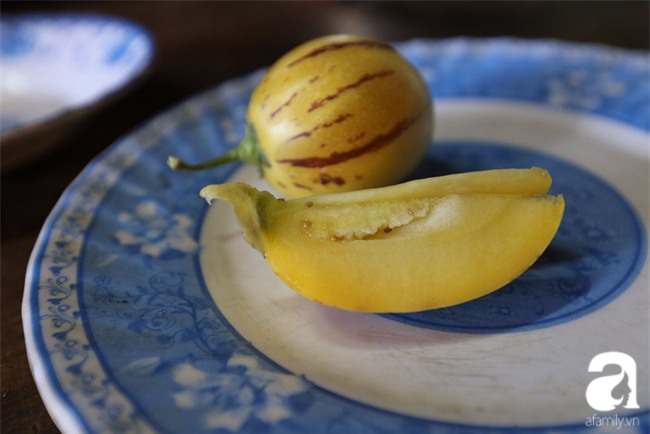 Những quả dưa chỉ nhỏ bằng nắm tay, trái nặng từ 200 tới 300g/trái, vỏ ngoài và ruột đều có màu vàng nhạt. Khi chín, trái dưa có vị ngọt mát màu vàng sọc tím. Chính đặc điểm này khiến giống dưa này trở nên lạ mắt với người tiêu dùng Việt Nam.