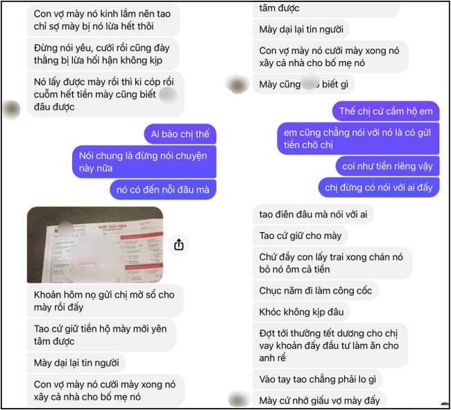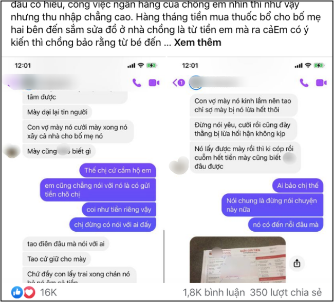 Chị chồng em bảo thời buổi bây giờ chẳng tin được ai. Đầy vụ việc vợ bỏ chồng xong cuỗm mấy trăm triệu bỏ đi, chồng tay trắng. Chồng em cũng gật gù bảo nếu như vậy chị cứ giữ tiền riêng cho em. Em cay hơn cả là câu chị chồng nhắn: ‘Nhà nó thì có cái gì, lấy chồng xong bố mẹ nó xây cả cái nhà lớn thế. Chẳng biết nó có gửi tiết kiệm đồng nào từ lương mày không hay cuỗm hết tiền cho bố mẹ nó rồi chẳng biết’.