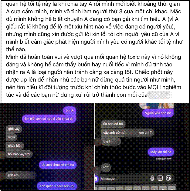 Cô vạch trần tiếp: "Hóa ra mình đã nhầm, A. quen cô bạn đó từ năm 2020 chứ không phải từ tháng 8 lúc chia tay mình. Điều khiến mình không còn lưu luyến mối tình tồi tệ này là mình phát hiện ra khi anh ta đang cưa cẩm mình, mình vô tình làm người thứ 3 của một chị khác. Mặc dù mình hoàn toàn không biết lúc đó A. đã có bạn gái nhưng mình cũng xin gửi lời xin lỗi tới người yêu cũ của A".
