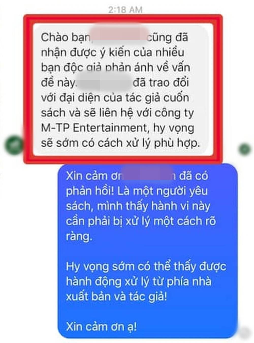 Ngay lập tức, phía nhà xuất bản sách cũng đã lên tiếng phản hồi về kiến nghị. Theo đó, đại diện nhà xuất bản cho biết đã tiếp nhận thông tin từ tác giả và gửi thư chính thức đến công ty M-TP để làm rõ sự việc.