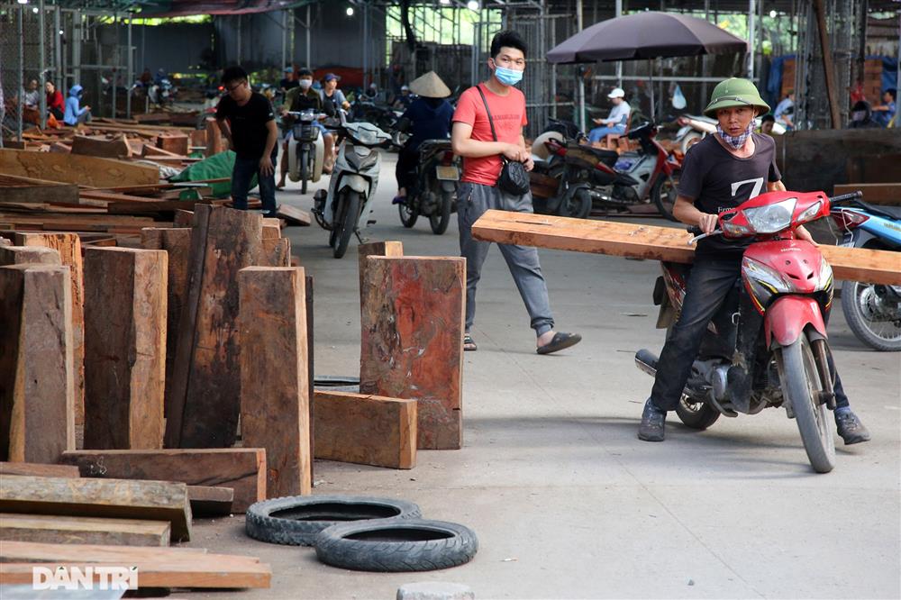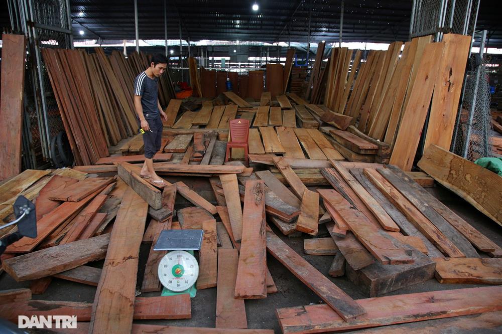 Chợ gỗ ở đây chia thành nhiều khu, mỗi khu lại bán một loại gỗ. Trong ảnh là khu vực chuyên bán các loại gỗ trắc. Gỗ được bán theo cân (kg), giá dao động từ vài trăm nghìn/kg.