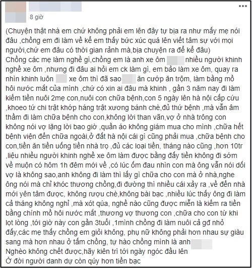 Chủ top chia sẻ thêm rằng, nhiều lúc bạn thấy xót quá vì chồng bạn lúc nào cũng miêt mài đi làm để kiếm tiền nuôi 2 mẹ con. Mỗi ngày ông xã T. đi làm từ 7 giờ sáng và "cày" đến tận 12 giờ đêm.