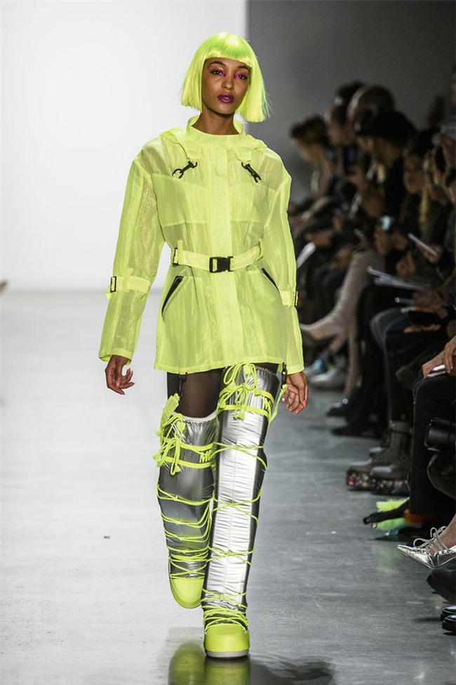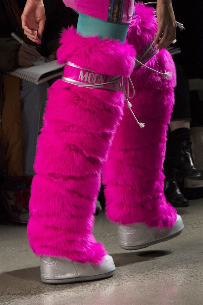 Như mọi lần, các thiết kế của Jeremy Scott đều khá phá cách, trẻ trung, mới lạ với tông màu chủ đạo là những gam màu ấm rực rỡ. Khi được pha trộn cùng nhau tạo thành những kiểu trang phục đa sắc màu, đặc biệt hút mắt người nhìn. Các mẫu boots thuộc dòng Moon Boots lần này cũng vậy, chúng hầu hết đều có màu cam neon, hồng neon hay vàng chanh chói mắt. Tuy nhiên, màu sắc là một chuyện, thứ khiến chúng trở thành đề tài bàn tán chính là phom dáng to và đồ sộ quá đỗi.