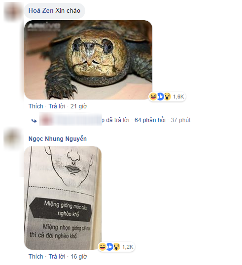 Ngoài ra, cũng có không ít cư dân người dùng mạng mang đôi môi “trái tim yêu dấu” này ra so sánh với… củ ấu, mỏ của chim gõ kiến hoặc miệng của những chú rùa biển. Nickname Nguyễn Ngọc Anh chia sẻ: “Mình chưa thấy ca cắt môi nào ghê như cái ca này. Đùa chứ bao nhiêu người làm cái vù, vừa làm xong nhìn đẹp chứ không như cái môi này, không khác gì mỏ chim, mỏ gà. Kiểu này mổ thóc no khỏi cần nấu cơm”.