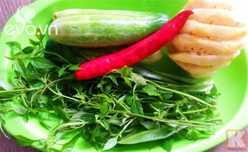 Ớt sừng rửa sạch, bỏ hạt, thái chỉ. Rau thơm rửa sạch, thái nhỏ vừa đừng thái quá nhỏ vì khi đem trộn sẽ khiến rau bị nát và bết.