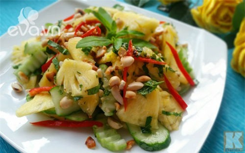 Từng miếng dứa quyện vị ngọt vào dưa chuột giòn giòn, món nộm thơm dậy mùi lạc rang, tỏi băm, các loại rau gia vị, cay vị ớt, chua vị chanh cực kì hấp dẫn.