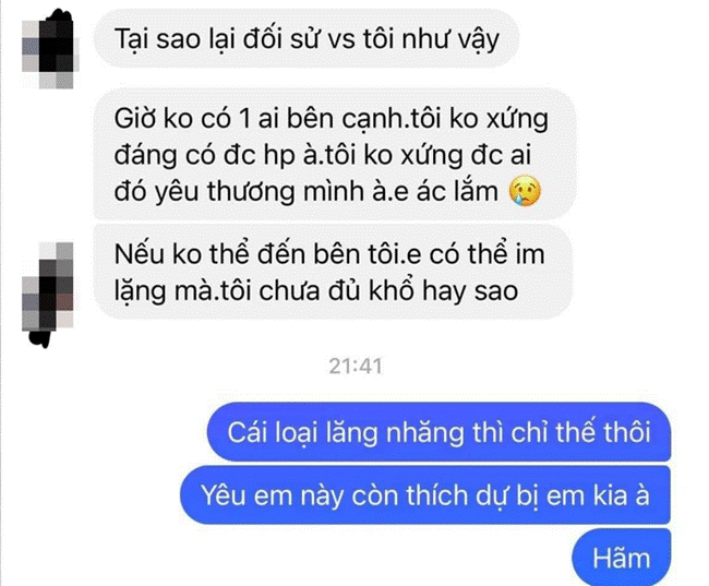 Đến nước này, anh ta bắt đầu xin xỏ và trách móc như bản thân mình đúng, bị cả thế giới đối xử sai: "Giờ không có ai bên cạnh tôi. Tôi không xứng đáng có được hạnh phúc à. Tôi không xứng được ai đó yêu thương mình à, em ác lắm".