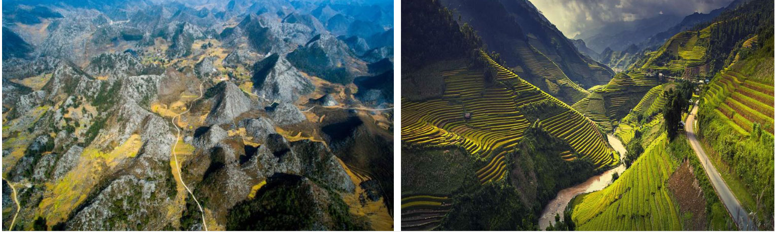 Hà Giang nổi tiếng với cảnh quan núi non hùng vĩ, thiên nhiên hoang sơ và đa dạng. Đây là nơi mà những ai mê xê dịch luôn chọn nó nằm trong list mà mình phải ghé đến một lần trong đời. Ở đây có những dãy núi tai mèo, những con dốc dựng đứng - là điểm cắt xén tạo độ khó để du khách một khi vượt qua rồi sẽ được tận hưởng khung cảnh như mơ của ruộng bậc thang xếp xanh xếp vàng trải dài, của dòng sông Nho Quế hay thung lũng đón mây nên thơ...