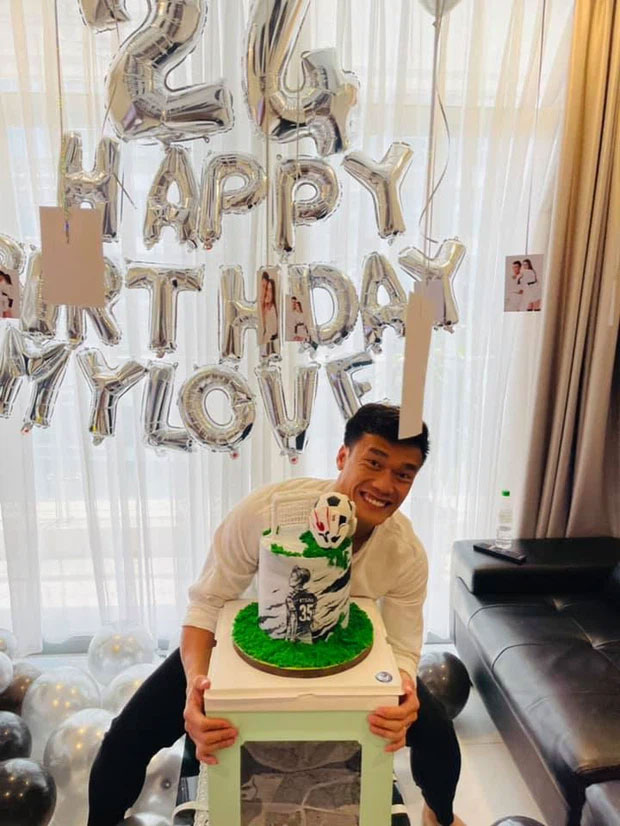 Bạn gái thủ môn Bùi Tiến Dũng tự tay chuẩn bị đồ trang trí, in ảnh và đặt bánh kem đặc biệt để tạo bất ngờ cho người yêu