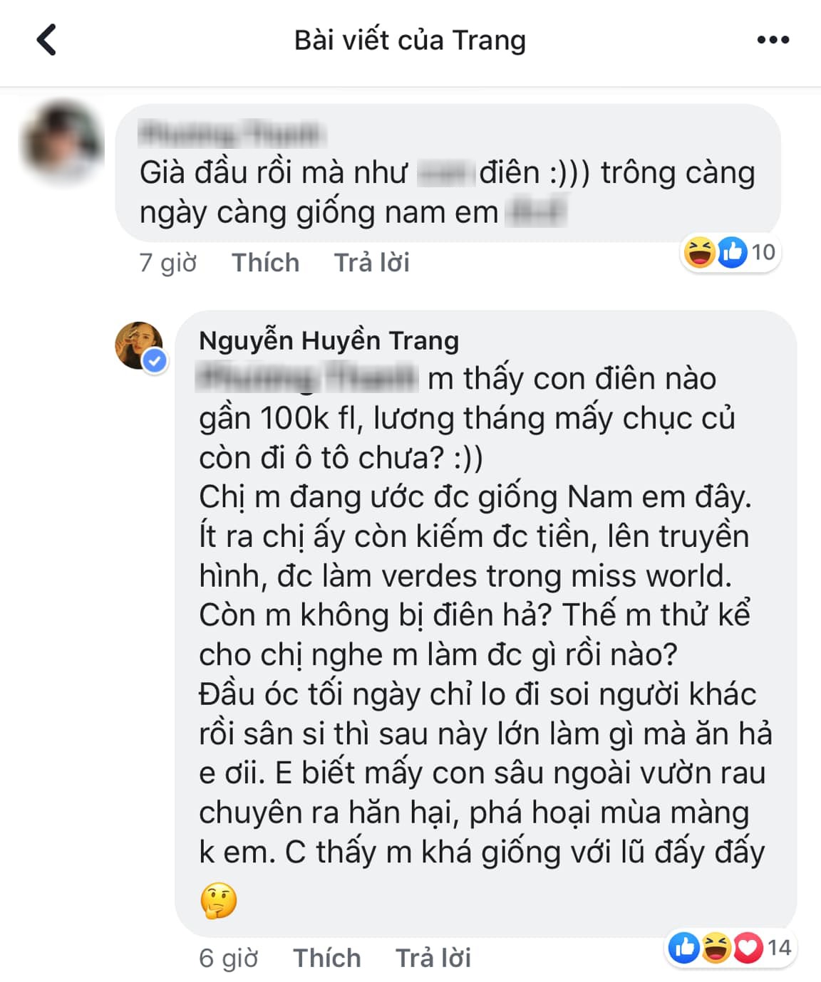 Nhưng Huyền Trang rất tức giận, đáp trả một tràng dài: "Bạn thấy con điên nào gần 100k follow, lương tháng mấy chục triệu và đi ô tô chưa? Mình đang mơ ước được giống Nam Em đây. Ít ra là chị ấy còn kiếm được tiền, lên truyền hình và làm Verdes trong Miss World. Còn bạn không bị điên hả? Thế bạn thử kể cho mình nghe bạn làm được gì rồi nào?