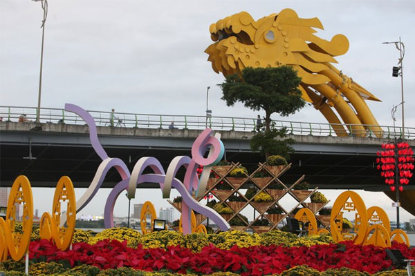 Đường hoa Xuân Đà Nẵng 2023 trải dài hơn 300m từ phía bờ Tây cầu Sông Hàn đến tận công viên APEC. Linh vật năm Quý Mão được xếp đặt nhiều trên đường hoa Bạch Đằng, đây là tuyến trung tâm sầm uất nhất thành phố.
