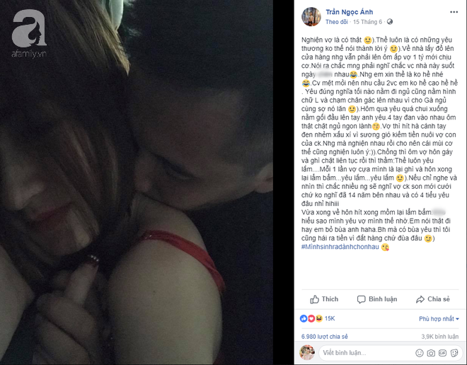 15K lượt thích, 7K lượt chia sẻ cùng 4K bình luận xuýt xoa ngưỡng mộ là những gì vợ chồng chị Trần Ngọc Ánh và anh Nguyễn Anh Quân nhận được chỉ sau một bức ảnh cùng những dòng tâm tình về tình cảm anh chị dành cho nhau trên MXH.
