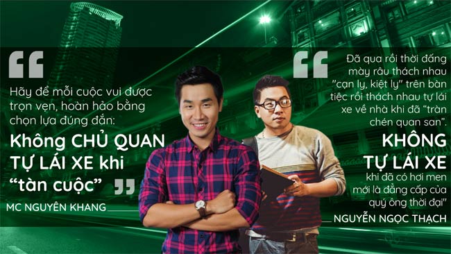 Giữa những quan điểm cũ, cho rằng lái xe sau khi uống rượu bia là“chuyện nhỏ”, những sao Việt hàng đầu như Victor Vũ, Cường Seven, Vũ Ngọc Anh, MC Nguyên Khang, Nhà Văn Nguyễn Ngọc Thạch, Hoa hậu Jolie Nguyễn đã chọn cách thể hiện đẳng cấp hoàn toàn khác để cuộc vui trở nên thật hoàn hảo.