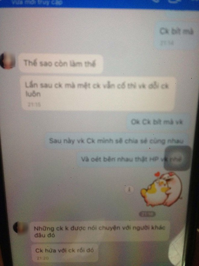 Sau khi phát hiện sự việc, mình gọi cho cô gái đó thì cô ta chặn số điện thoại. Cô ta còn xui chồng mình về đánh mình. Anh ta cứ đi đêm về chán lại lôi mình ra đánh. Có lần còn đạp vào bụng mình trong khi còn vài ngày nữa là mình sinh em bé. Mọi chuyện xảy ra mình có nói với ba mẹ chồng, nhưng ông bà chỉ khuyên lơ đi và nói "cóc chết 3 năm quay đầu về núi", ý nói mình nhịn đi nhưng mình bực lắm".