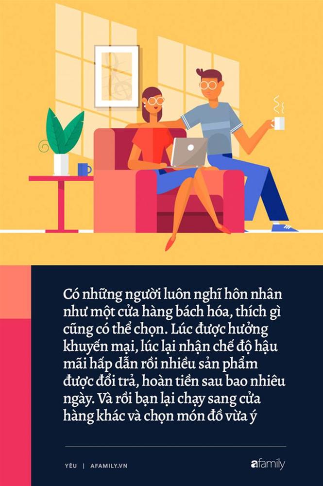 Có những người luôn nghĩ hôn nhân như một cửa hàng bách hóa, thích gì cũng có thể chọn. Lúc được hưởng khuyến mại, lúc lại nhận chế độ hậu mãi hấp dẫn rồi nhiều sản phẩm được đổi trả, hoàn tiền sau bao nhiêu ngày. Và rồi bạn lại chạy sang cửa hàng khác và chọn món đồ vừa ý mình hơn ư?