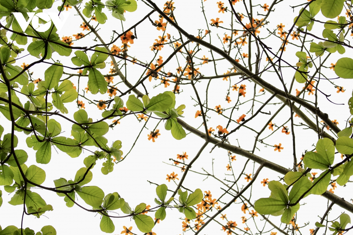 Mùa hoa gạo vào tháng 3 cùng thời điểm với mùa bàng thay lá. Hình ảnh những bông hoa gạo vàng xen với những đám lá bàng non trông vô cùng bắt mắt.