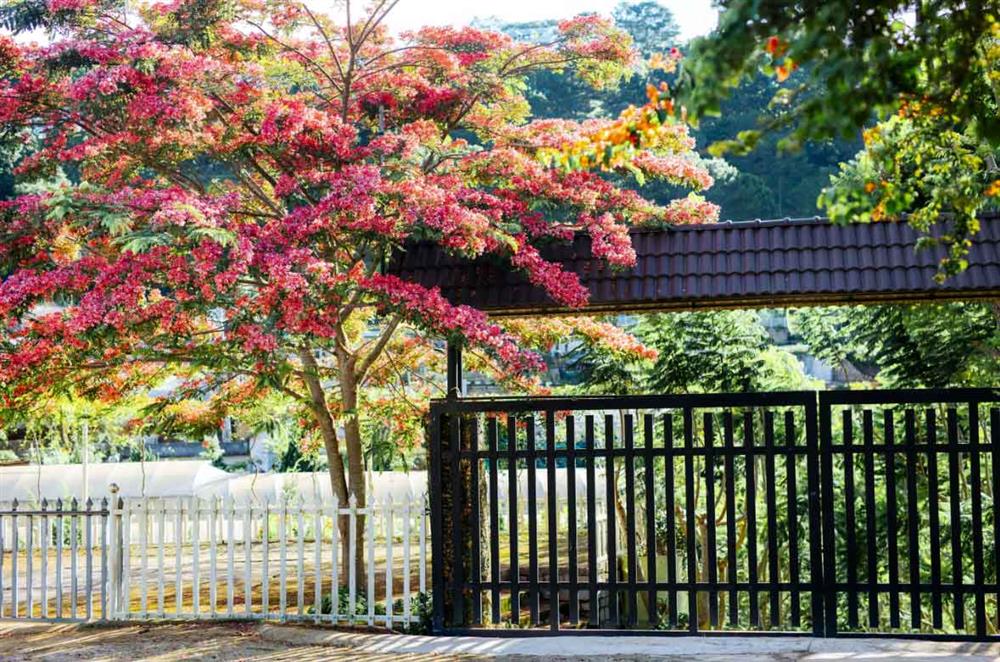 Một cây phượng hồng nằm tại cuối đường Trần Thái Tông (phường 9, Đà Lạt, Lâm Đồng) đang gây sốt trên mạng xã hội khi bung nở rực rỡ. Cây phượng nằm sát cổng gỗ đen và hàng rào trắng xinh xắn tạo thành bối cảnh check-in lý tưởng cho du khách (Ảnh: Đồng Ngô)